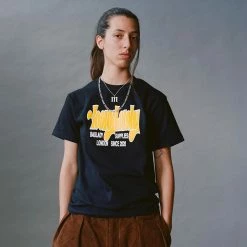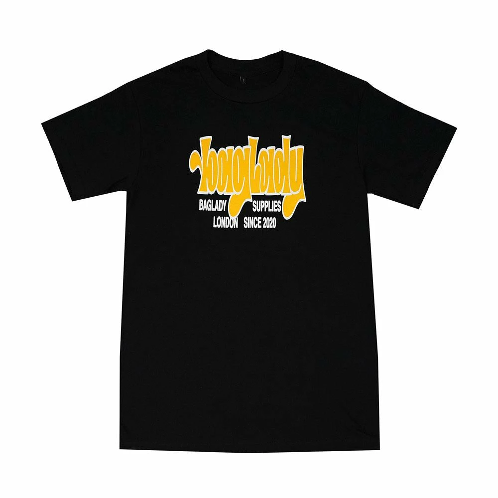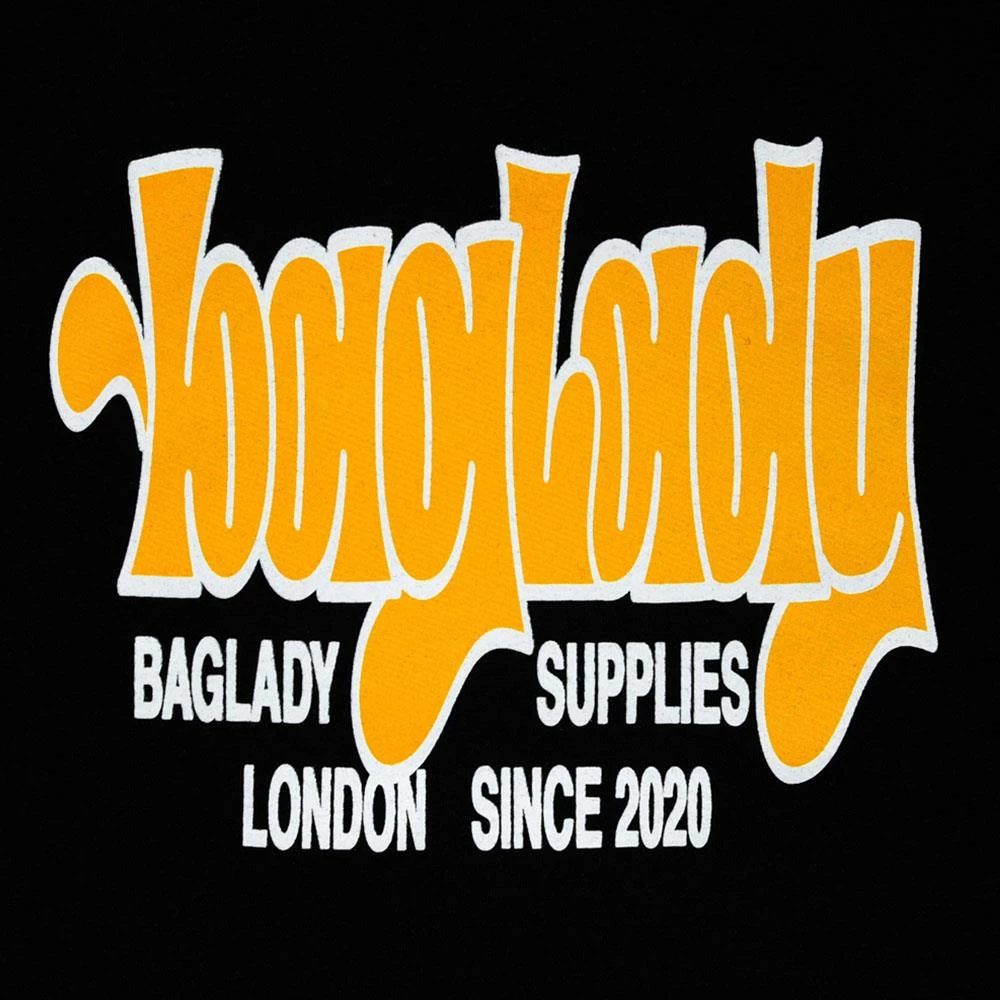 Baglady ‘Stretch Logo’ Black cotton T-shirt. Featuring a 2 layer screenprint of the classic Baglady ‘Throwy’ logo stretched and obscured – orange fill with a white outline on black. Baglady Supplies is a brand from South East London headed by Tom Delion. Baglady focuses on photography, the analogue process and the DIY approach.