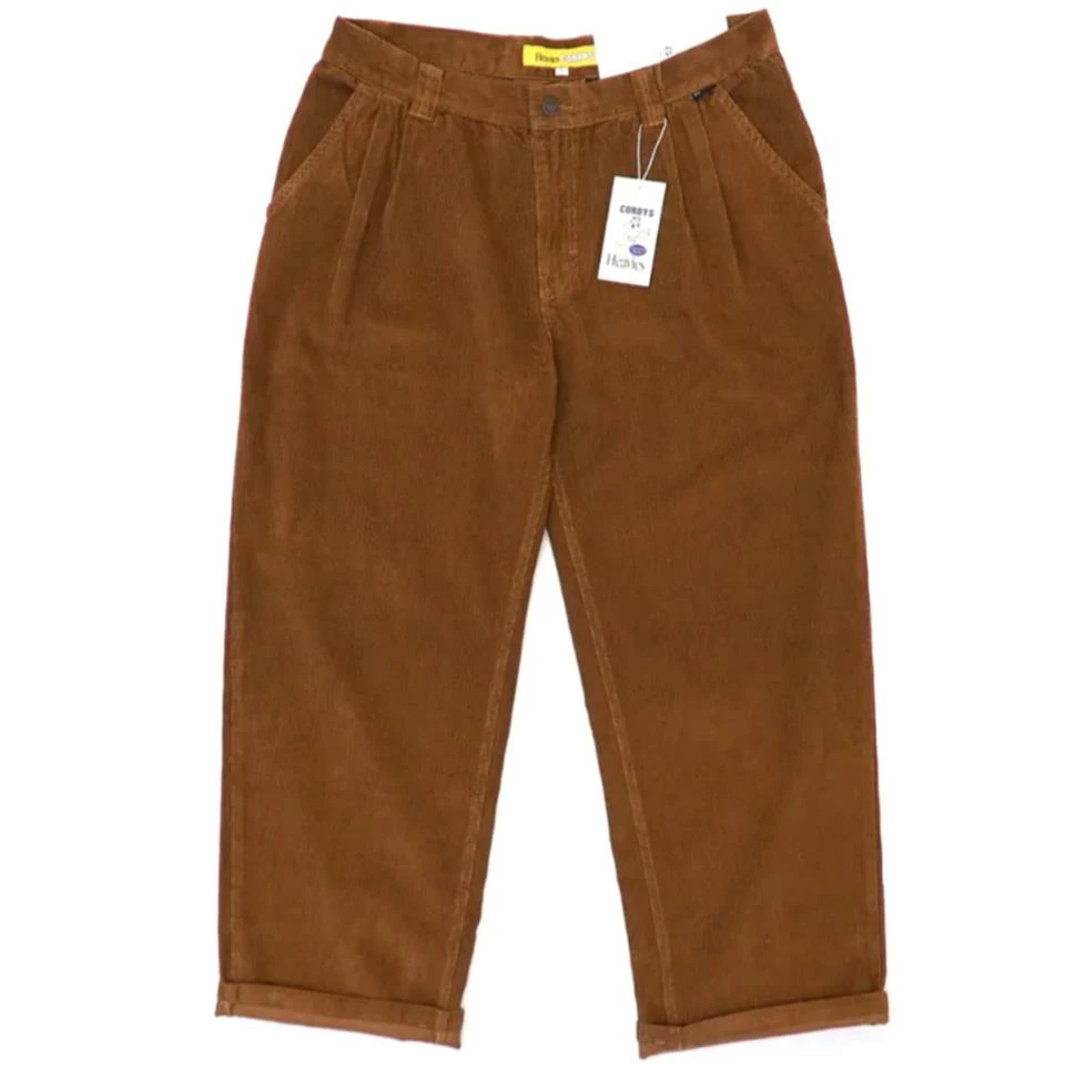 100% corduroy denim baggy fit trousers. Includes pleated pockets, side pockets and custom Heavies button.