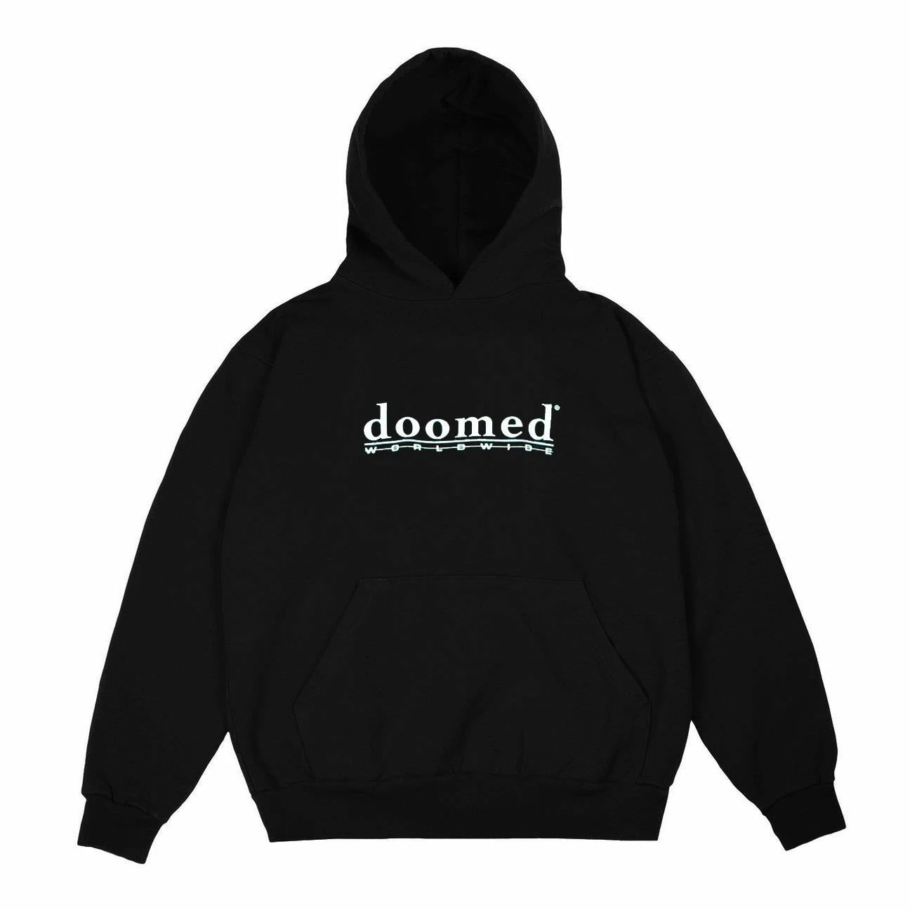Pre-shrunk fleece knit hoodie from Doomed with printed chest design and kangaroo pocket.