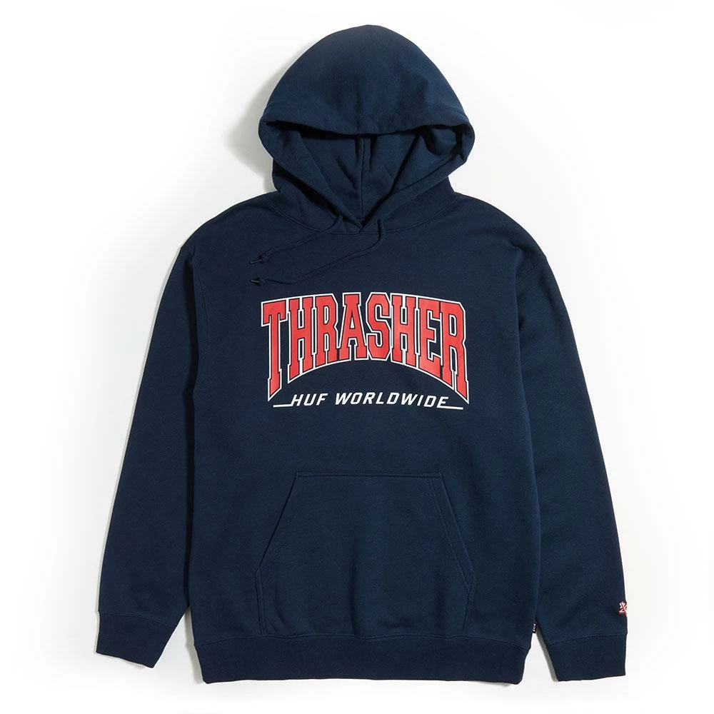 Two iconic brands from the bay area, HUF and Thrasher join forces for this limited retro baseball inspired collection. This navy Bayview Hoody is a regular fit, featuring the classic Thrasher printed graphic with HUF Worldwide below, ribbed trims, drawstring hood and kangaroo pouch. 80% cotton 20% polyester.