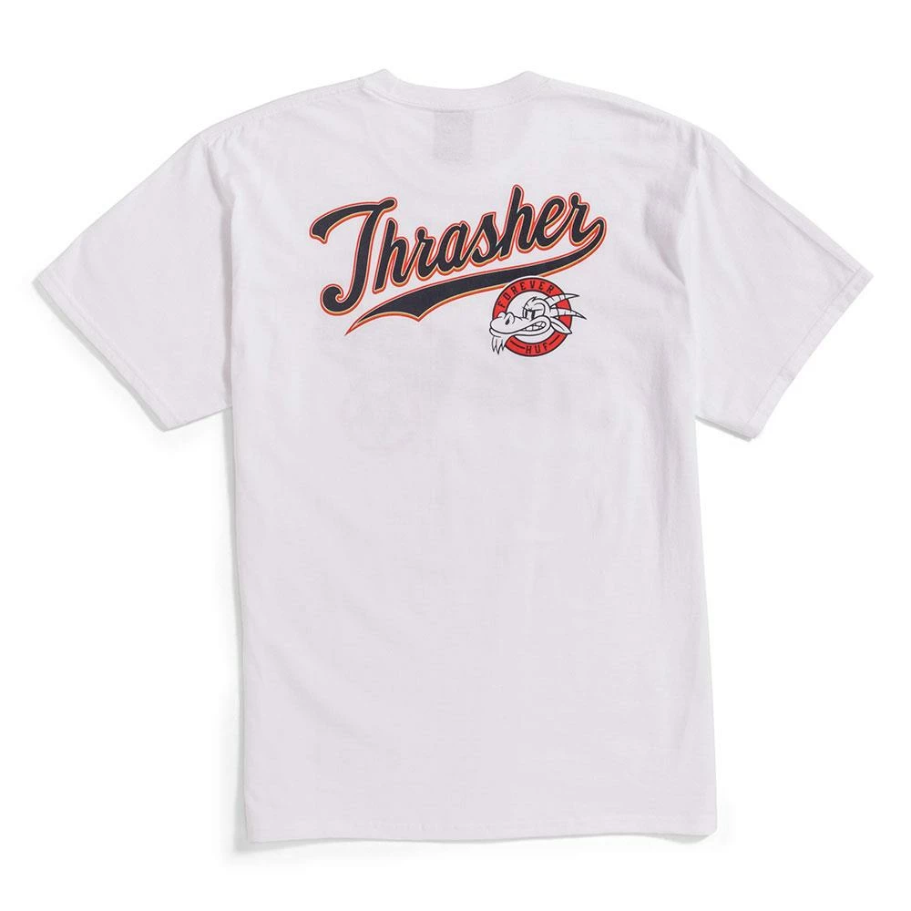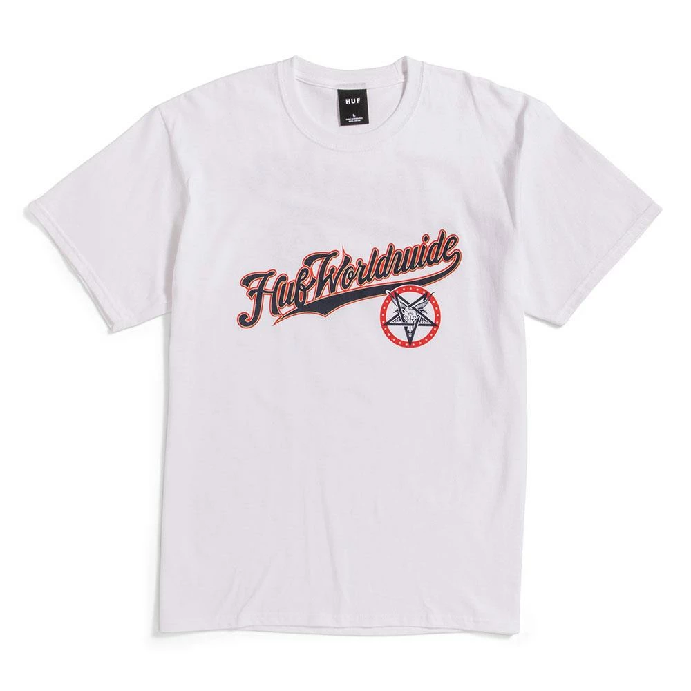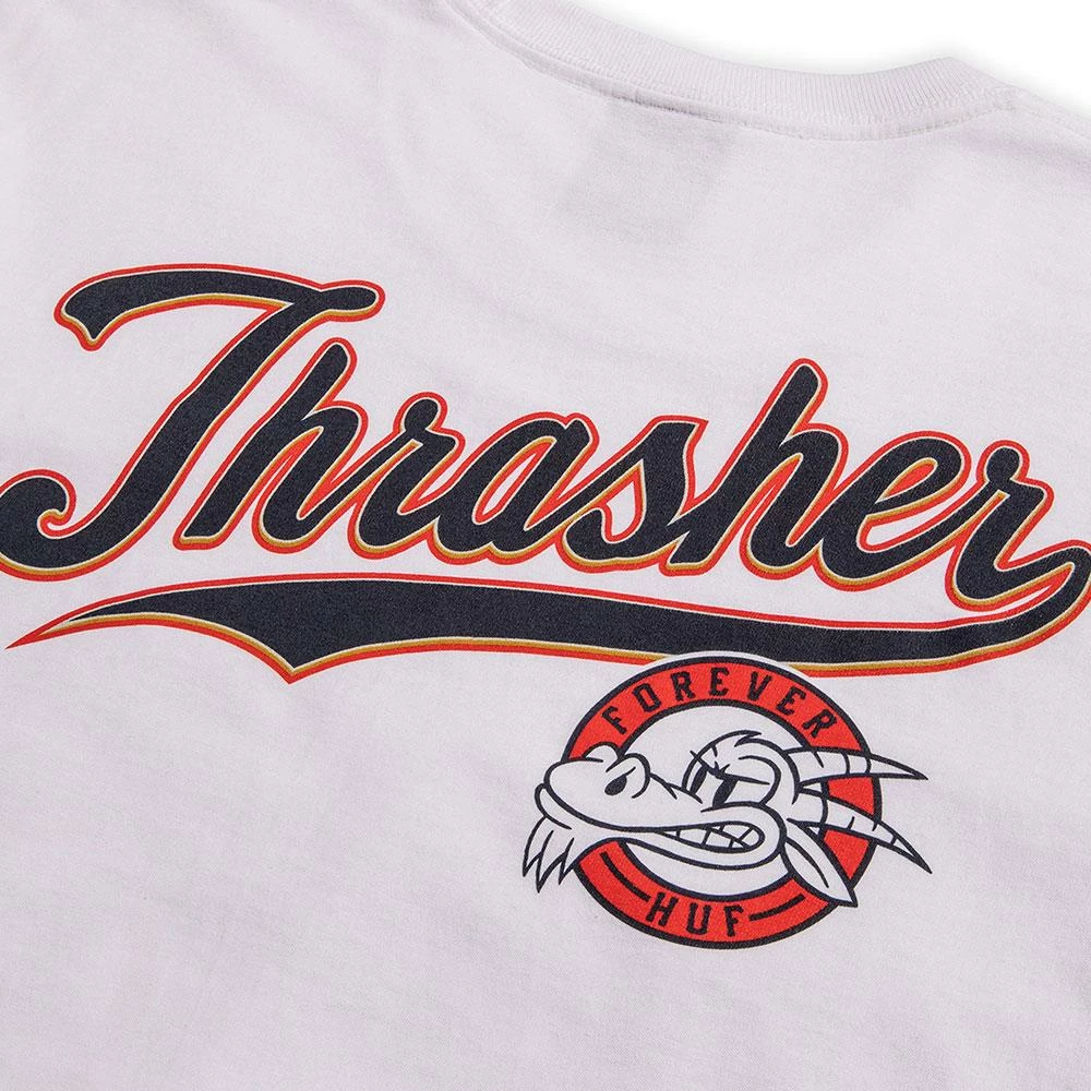 Two iconic brands from the bay area, HUF and Thrasher join forces for this limited retro baseball inspired collection. This white short sleeve Portola T-Shirt is a regular fit and features a classy HUF x Thrasher graphic on the front with a skate goat graphic variation on the back. 100% cotton.
